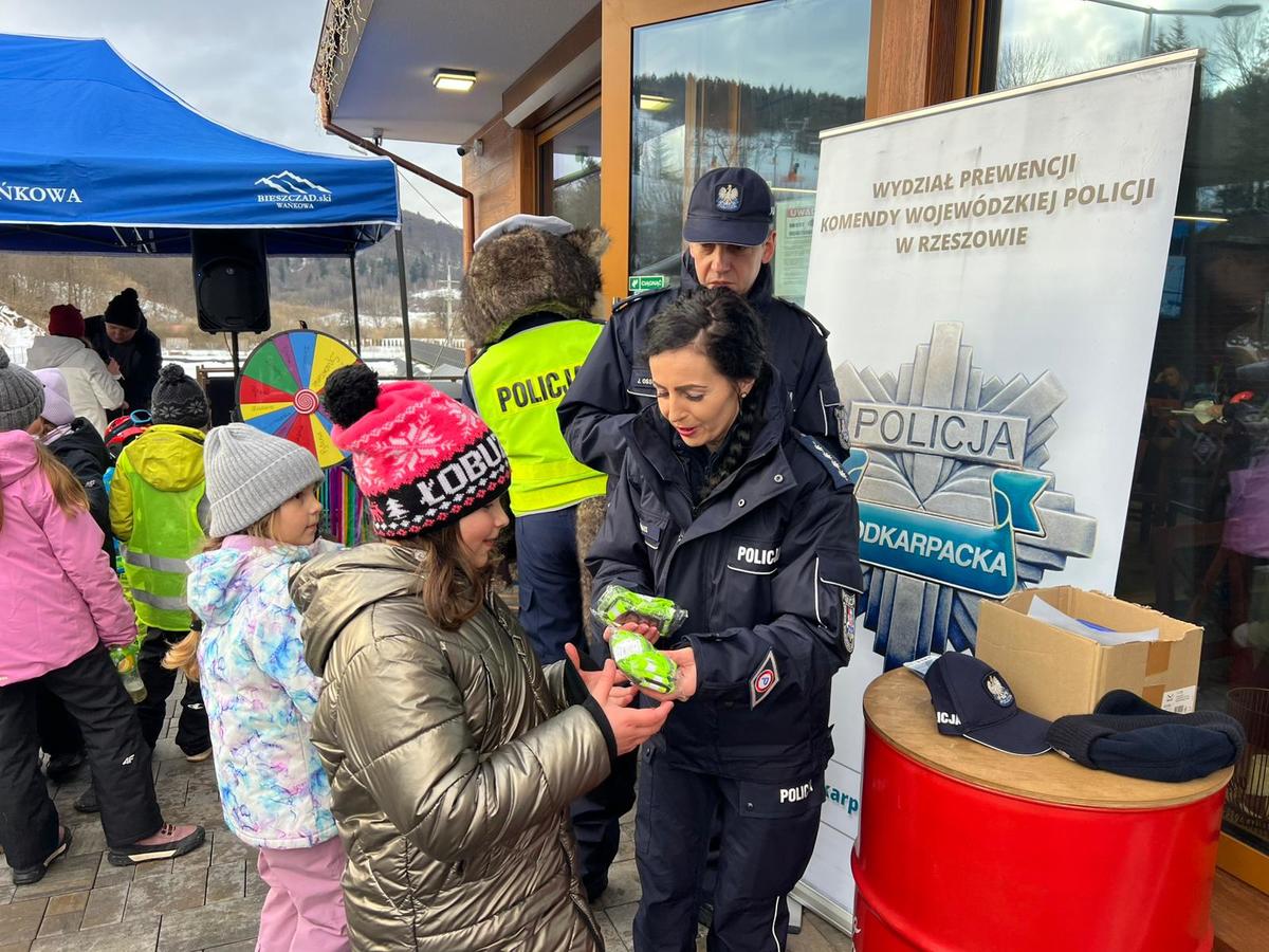 W trakcie ferii zimowych lescy policjanci intensyfikują działania profilaktyczno-edukacyjne, aby zimowy wypoczynek był nie tylko pełen wrażeń, ale przede wszystkim bezpieczny dla każdego uczestnika. Jednym z takich przedsięwzięć była wspólna akcja z policjantami Wydziału Prewencji Komendy Wojewódzkiej Policji w Rzeszowie, która tym razem odbyła się na stacji narciarskiej Wańkowa, w gminie Olszanica. Spotkanie z policjantami odbyło się w środowe popołudnie, podczas animacji, na którą do Wańkowej zjeżdżają mali narciarze z całych Bieszczad. Dzięki temu bierze w nich udział duża liczba amatorów zimowych aktywności. Mundurowi promowali kampanię „Bezpieczne Ferie ” oraz „Kręci mnie bezpieczeństwo w zimie”, zachęcając uczestników do aktywnego udziału w zajęciach i konkursach edukacyjnych.